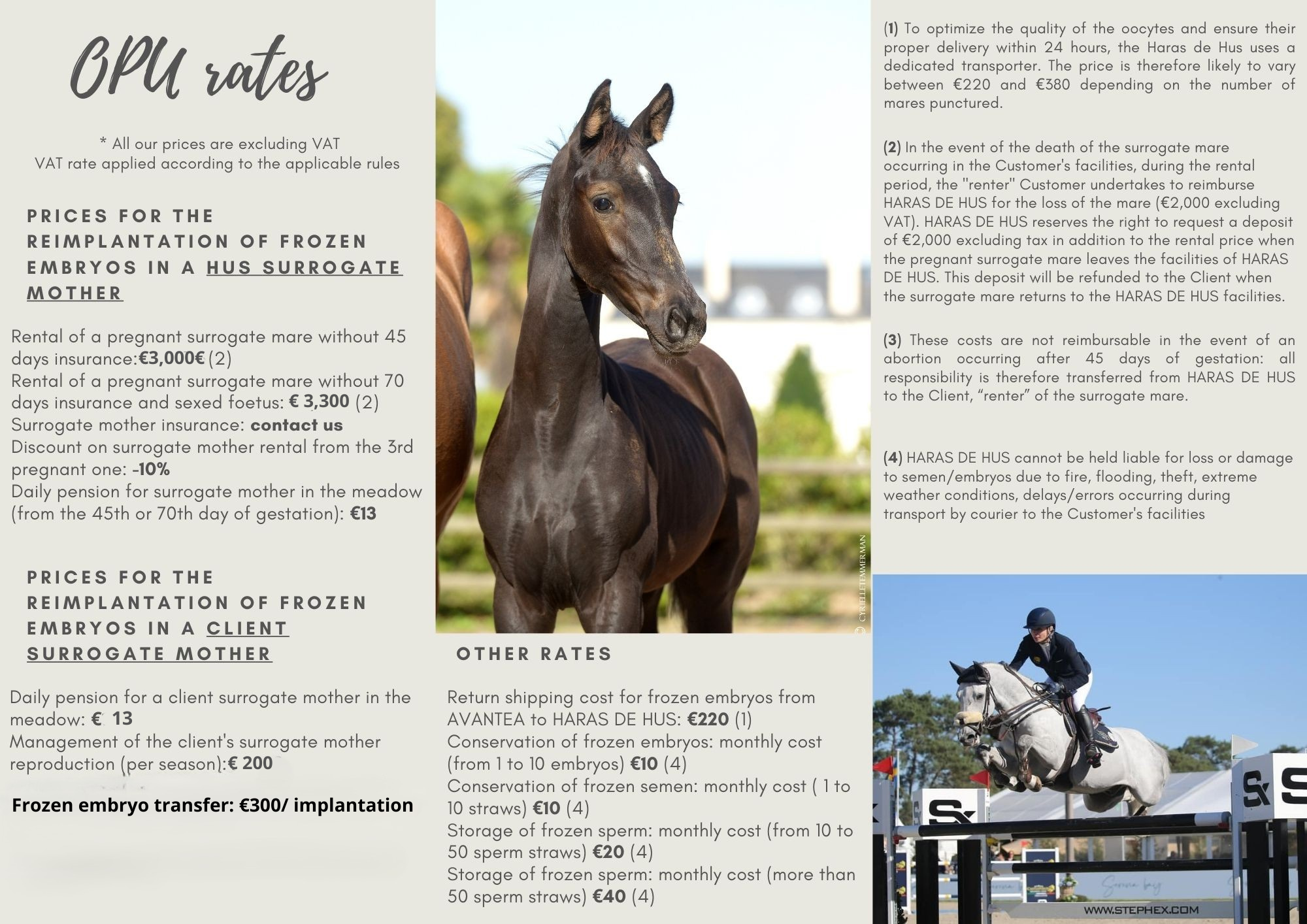 (1) To optimize the quality of the oocytes and ensure their proper delivery within 24 hours, the Haras de Hus uses a dedicated transporter. The price is therefore likely to vary between €220 and €380 depending on the number of mares punctured